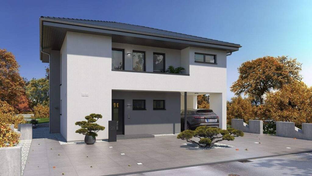 Attraktive Architektur und hoher Wohnkomfort vereinen sich bei unserer Stadtvilla 20 zu einer wahrhaft gelungenen Symbiose. Ein Zugang zu den Wohnräumen im Erdgeschoss ist nicht nur durch die Eingangstür, sondern auch direkt über den integrierten Carport möglich, sodass man bei schlechtem Wetter seine Einkäufe trockenen Fußes in den angrenzenden Hauswirtschaftsraum bringen kann. Offen und, dank vieler Glasflächen, sehr hell präsentiert sich der kombinierte Wohn-Koch-Essbereich. Im Obergeschoss trennt eine geräumige, zentral gelegene Galerie den Elternbereich mit Schlafzimmer und angeschlossenem großem Badezimmer von den beiden Kinderzimmern, zu denen ein weiteres Badezimmer mit Dusche und WC gehört. Von der Galerie gelangt man auch direkt in die einladende Loggia. Eine weitere, über dem Vordereingang gelegene und von den beiden Badezimmern zugängliche Loggia, bietet bei Wind und Wetter die Möglichkeit, frische Luft zu schnappen und ungestört zu relaxen.