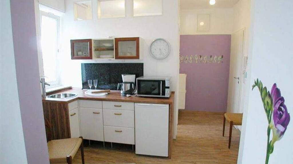 Die Küche verfügt über eine Kücheneinrichtung mit Kühlschrank, Waschbecken, Induktionskochplatte, Mikrowelle mit Grill und Heißluft, Besteck und Geschirr, etc....