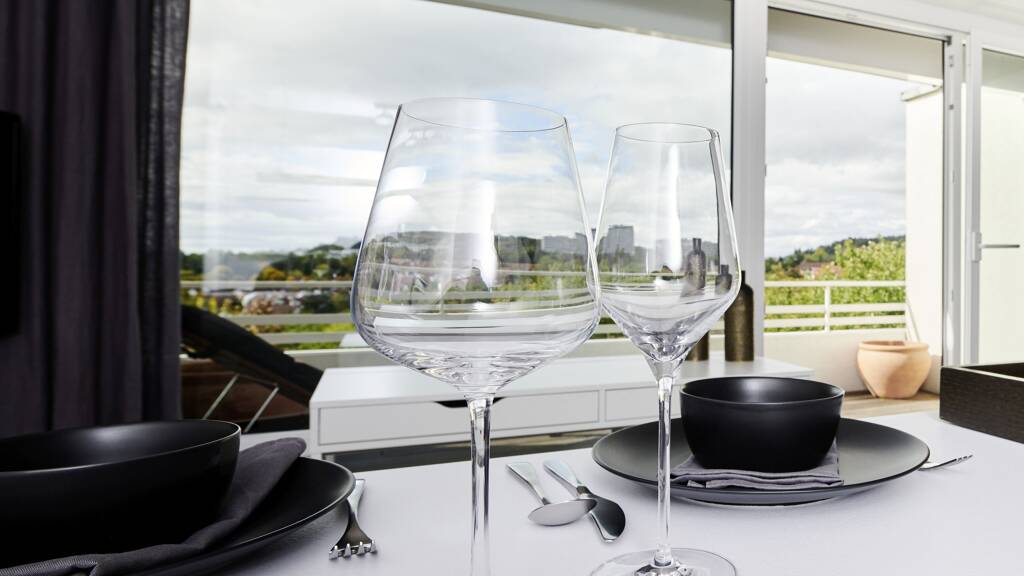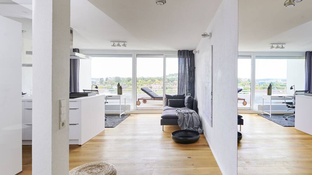 Das schöne Apartment wurde gemütlich eingerichtet und ist durch die bodentiefen Fenster lichtdurchflutet. Die Terrasse mit Blick auf den Hohenzollern erreicht man bequem über eine Schiebetür, es gibt eine elektrische Markise und ebenfalls elektrische Jalousien, die verstellt werden können, um den Lichteinfall variieren zu lassen. Am Abend bezaubert eine romatische Außenbeleuchtung die schöne Holzterrasse.