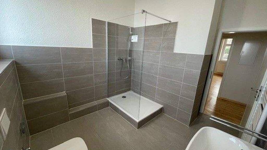 - Premiumbad: Dusche mit Glaskabine, Hänge WC, Waschbecken, hochwertige, Armaturen, graue Boden und Wandfliesen, Format 30 cm x 60 cm, Waschmaschinenanschluss - Küche: graue Bodenfliesen, weißer Fliesenspiegel, Format 30 cm x 60 cm - Vinyldesignboden in Eicheoptik - Raufasertapete mit weißem Anstrich - neue Wohnungstür, Zimmertüren, Zargen, Heizkörper, weiß - Elektrik auf neustem Niveau - neue Fenster