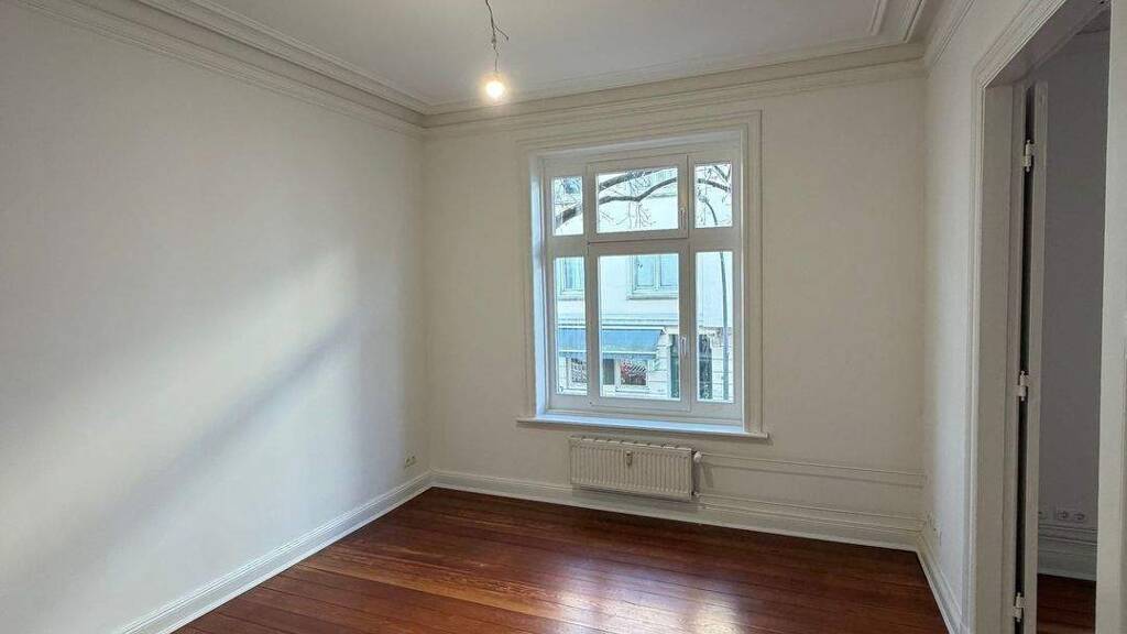Der Jugendstilcharakter dieser Wohnung wird durch die bautypischen Stiltüren nebst Türzargen und Türklinken, die vorhandenen Fensterverkleidungen, einer Deckenhöhe von ca. drei Metern sowie den Holzdielenfußböden in Pitchpine dokumentiert. Auch die originalen Stuckornamente sowie die Hamburger Fußleisten wurden erhalten.