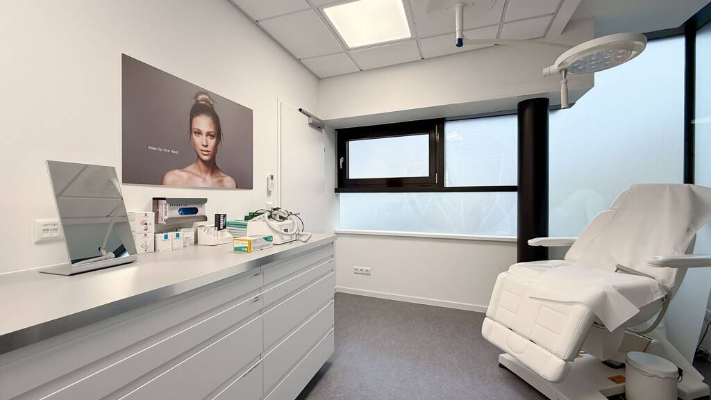 Der Wartebereich bietet Sitzplätze für bis zu 16 Personen, sowie Zugang zu den Zimmern. Hinter dem Anmeldetresen befindet sich ein Aufenthaltsraum für Mitarbeiter sowie ein Badezimmer mit WC und Dusche. Das barrierefreie WC für Kunden/Patienten befindet sich im Anschluss zum Anmeldebereich.