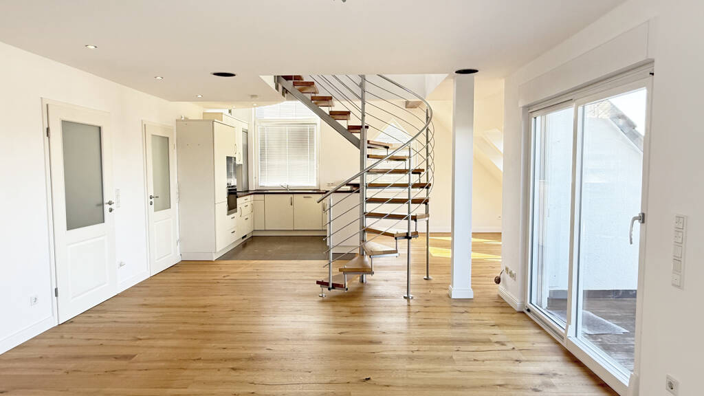 Eingangsbereich/Flur, grandioses, helles Wohn-/Esszimmer mit großen Fenstern und Dachflächenfenstern, offenem Küchenbereich und Zugang zum großen Balkon (Blick bis zum Kaiser-Wilhelm-Denkmal), großes Schlafzimmer, großes Kinderzimmer, hell gefliestes Bad mit Eckbadewanne, ebenerdiger Dusche und Fenster. Gästezimmer, kleiner Flur und Duschbad mit Fenster.