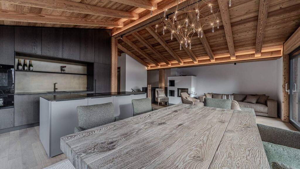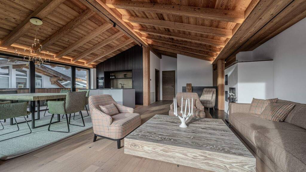Im Dachgeschoss erwartet Sie ein offener Wohn- /Essbereich mit einem einladenden Kamin, einem wunderschönen Sichtdachstuhl und einer Designerküche, ausgestattet mit hochwertigen Elektrogeräten von Miele und Liebherr. Hier finden Sie auch den großzügigen Masterbereich mit separater Ankleide und Bad en suite. Jedes Stockwerk verfügt über ein Beleuchtungssystem von Molo Luce sowie eine Videosprechanlage. Die geräumigen Balkonflächen lassen Sie den faszinierenden Ausblick auf den Wilden Kaiser und das Kitzbüheler Horn genießen.