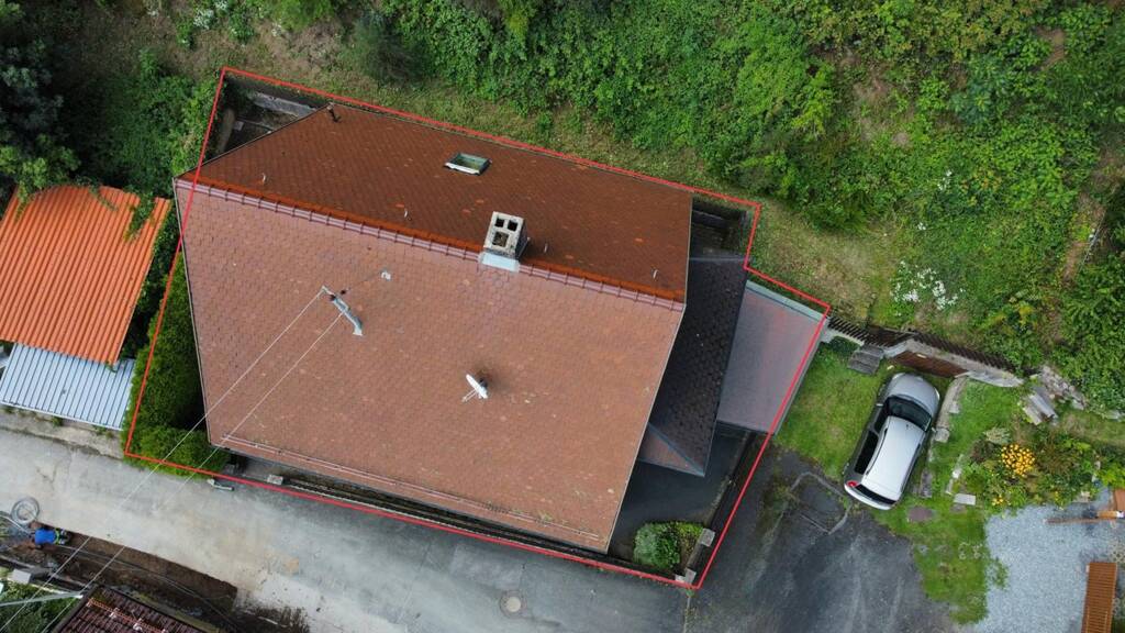 Das Grundstück liegt am Ortsrand in Hanglage und bietet Privatsphäre sowie direkten Zugang zu Grünflächen. Der kleine Vorgarten und die angrenzenden Gartenflächen sind pflegeleicht angelegt.