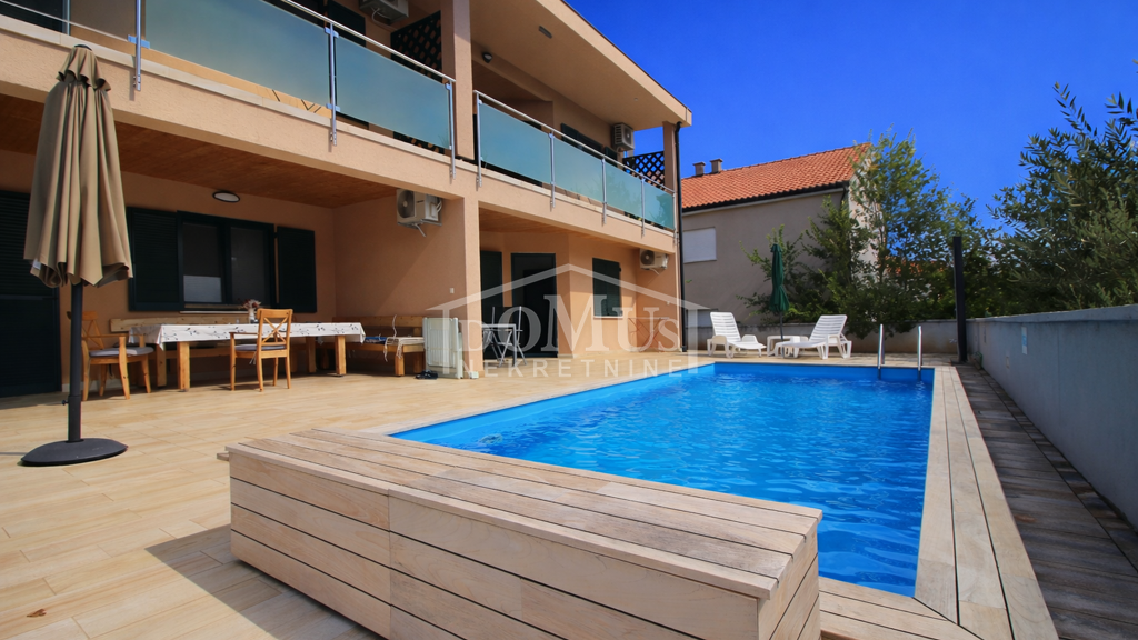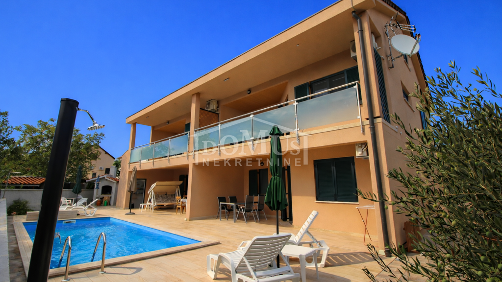 Neubau in ruhiger Umgebung, Haus mit insgesamt 453,30 m2 Wohnfläche mit 4 Wohneinheiten. Im Untergeschoss befinden sich zwei Speisekammern. Der Haupteingang zum Erdgeschoss, wo sich ein Flur, eine Innentreppe und eine möblierte S1-Wohnung mit zwei Schlafzimmern und einer Loggia von 25,26 m2 und eine S2 Wohnung mit einem Schlafzimmer und einer Loggia von 13,20 m2 befinden. Beide Wohnungen haben Zugang über die Loggia zum gepflegten Garten und Pool (7,80m x 3,35m). Eine Innentreppe führt in den 1. Stock, wo sich eine möblierte S3-Wohnung mit zwei Schlafzimmern und einer überdachten Terrasse von 17,96 m2 und eine möblierte S4-Wohnung mit einem Schlafzimmer und einer überdachten Terrasse von 17,34 m2 befindet. Beide Wohnungen haben Poolblick. Das Dachgeschoss ist im Rohbauzustand und bietet Platz für 2 weitere Wohnungen. Die Grundstücksfläche beträgt 674m2. Der Hof ist komplett eingezäunt und hat einen Pool, einen Grill und einen Parkplatz für Autos. Die Entfernung zum Meer beträgt nur 250m und zum Zentrum sind es lediglich 800m.