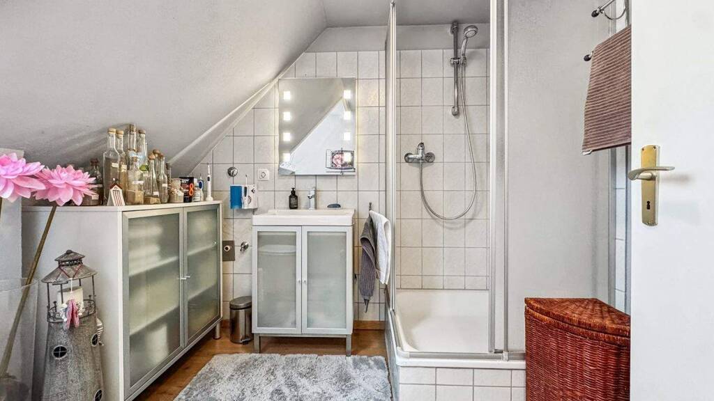 Im ersten Obergeschoss liegt eine vermietete Zweizimmerwohnung. Zudem befindet sich hier der Zugang zu einer renovierten Maisonettewohnung, die aktuell leer steht. Diese verfügt über einen Balkon, eine Küche sowie ein Badezimmer mit Badewanne und Duschwanne.