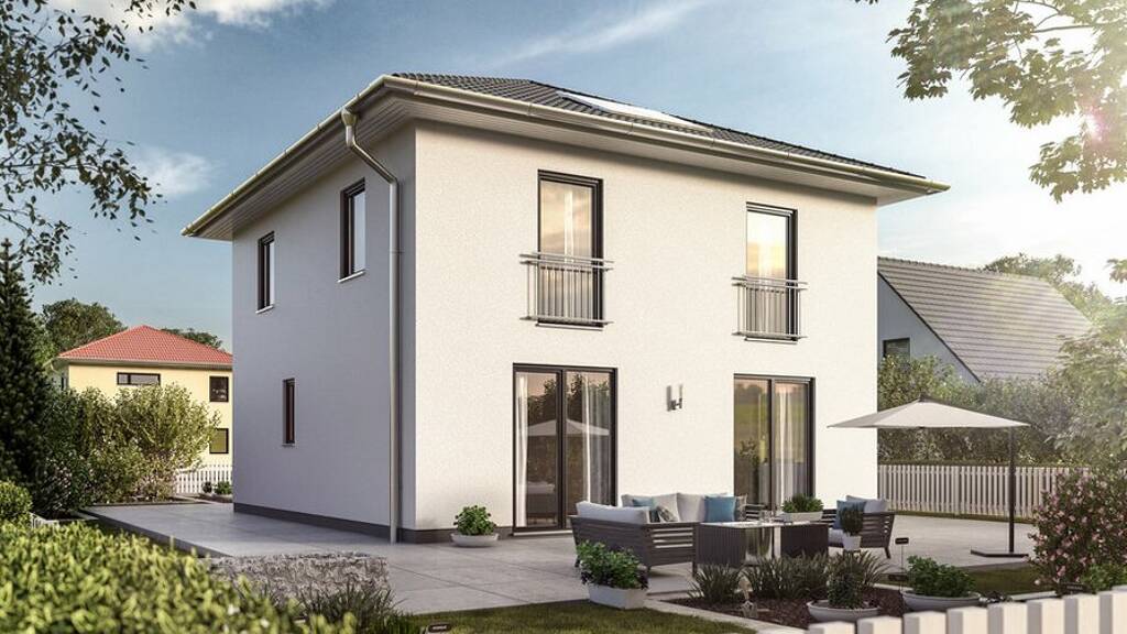 Die kubische Form ist der Klassiker im Stadthausdesign und prägt auch das Aussehen unseres Stadthaus Flair 124. Im Inneren setzt sich der urbane Stil fort: der großzügige Wohn- und Essbereich erstreckt sich über die gesamte Hausbreite und ist das Herzstück des Hauses. Große Fenster lassen viel Tageslicht hinein und führen gleich hinaus zu Ihrem Wohnzimmer im Grünen – der Terrasse.