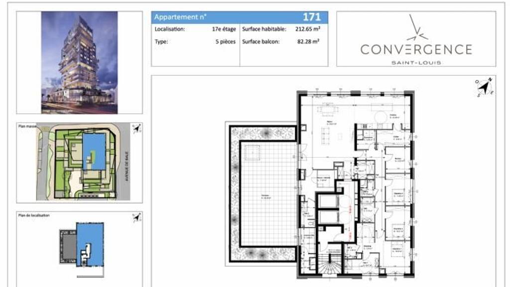 description de l'emplaceme Im Stadtzentrum und an ruhiger Lage mit herrlichem Panoramablick auf den Schwarzwald, Basel, den Jura oder die Vogesen, in einem 60m hohen Turm mit 17 Stockwerken. Zu Fuss von allen Bus-, Tram-, Zugverbindungen nach Basel und allen Dienstleistungen. agencement de l’espace 5-Zimmer-Wohnung von 212,65 m2 im obersten Stockwerk, mit einem herrlichen Balkon von 82,28 mit integrierter Außenküche bestehend aus einer Eingangshalle, einer offenen Küche zu einem Wohnzimmer von 53,01 m2, drei Schlafzimmern, zwei Bädern, einem Badezimmer, eines mit einem Entspannungsbereich - Sauna und das andere in einem Schlafzimmer, eine Speisekammer, eine Waschküche und eine Garage im Untergeschoss mit einem Stellplatz.