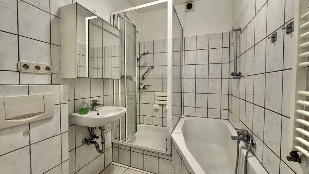 Das hell geflieste Badezimmer ist funktional ausgestattet und verfügt sowohl über eine Badewanne als auch über eine separate Dusche - ideal für entspannte Momente oder den schnellen Start in den Tag.