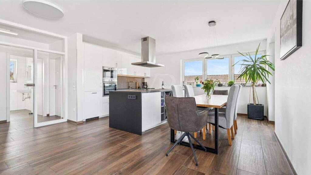 Schon die Ankunft ist etwas Besonderes: Der Aufzug bringt Sie direkt in Ihre Wohnung und eröffnet den Blick auf ein lichtdurchflutetes und durchdachtes Raumkonzept. Das Herzstück ist der elegante Wohn- und Essbereich mit offener Einbauküche - ein Ort, an dem interaktives Kochen und Zusammensein mit den Liebsten zu unvergesslichen Momenten werden. Eine große Fensterfront läd die Sonne jederzeit ein, die vorhandenen Raffstores schützen bei Bedarf. Von hier aus gelangen Sie auf die traumhafte Dachterrasse, ein wunderbarer Rückzugsort über den Dächern der Stadt.