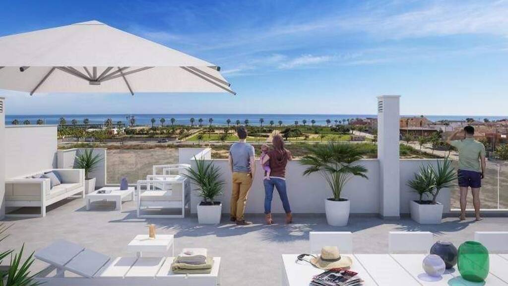 Lage in der reizvollen Stadt Pilar de la Horadada, bietet dieses exklusive Wohnensemble ein einzigartiges Leben direkt am Meer. Mit insgesamt 25 Immobilien können Bewohner von atemberaubenden Meerblicken aus dem Komfort ihres Zuhauses profitieren. Das Angebot umfasst verschiedene Typologien, die sich an unterschiedliche Bedürfnisse und Lebensstile anpassen, wie Apartments, Penthäuser, Reihenhäuser und Bungalows in Erd- und Obergeschoss. Alle Wohnungen sind so konzipiert, dass Komfort und Funktionalität maximiert werden, mit Optionen von 2 oder 3 Schlafzimmern und 2 Bädern, ideal für Familien oder Paare, die zusätzlichen Raum suchen. Die Nähe zum Meer, nur 1 km entfernt, und zum Flughafen, 15 km, sorgt für hervorragende Konnektivität und Zugang zu wesentlichen Dienstleistungen. AUSSENBereits die Außenmerkmale der Immobilien erhöhen ihren Reiz und ihre Funktionalität. Jede Wohnung verfügt über eine private Terrasse, perfekt, um das mediterrane Klima und den Meerblick zu genießen. Darüber hinaus bieten einige Typologien eine Sonnenterasse, die zusätzlichen Außenraum zum Entspannen oder Geselligsein schafft. Private Gärten sind in bestimmten Wohnungen eine Option und bieten eine persönliche Oase der Ruhe. Für eine luxuriöse Note verfügen einige Immobilien über einen privaten Pool, ideal zum Abkühlen an heißen Tagen. Das Design der Außenbereiche wird durch elektrische Rollläden ergänzt, die nicht nur Komfort, sondern auch einen modernen und eleganten Akzent setzen. INNENRAUMDer Innenraum der Wohnungen ist sorgfältig gestaltet, um maximalen Komfort und Stil zu bieten. Die Bodenbeläge aus Keramikporzellan verleihen eine elegante und langlebige Oberfläche, während die Klimaanlage das ganze Jahr über ein angenehmes Ambiente sicherstellt. Die Küchen sind mit modernen Geräten ausgestattet, die den Alltag erleichtern. Eingebaute Kleiderschränke in den Schlafzimmern bieten effizienten und ordentlichen Stauraum. Jedes Detail wurde bedacht, um einen einladenden und funktionalen Raum zu schaffen, in dem Qualität und Design ein außergewöhnliches Zuhause schaffen. GEBÄUDEGEMEINSCHAFTENDie gemeinschaftlichen Bereiche des Wohnkomplexes sind darauf ausgelegt, einen aktiven und sozialen Lebensstil zu fördern. Die Bewohner können von großzügigen Gartenbereichen profitieren, ideal zum Spazierengehen oder draußen Entspannen. Das Gemeinschaftspool bietet einen idealen Ort zum Schwimmen und soziale Kontakte mit Nachbarn und Freunden. Außerdem verfügt der Wohnkomplex über eine gemeinschaftliche Garage und Parkmöglichkeiten, die Komfort und Sicherheit für alle Bewohner gewährleisten. PILAR DE LA HORADADA Pilar de la Horadada an der Costa Blanca ist eine Küstenstadt mit feinem Sandstrand und einer ruhigen Atmosphäre. Ihre Küste, wie der Mil Palmeras Strand, zieht Besucher auf der Suche nach Sonne und Meer an und ist ein beliebtes Reiseziel im Sommer. Der Tourismus in Pilar de la Horadada konzentriert sich auf Strände und Wassersportarten wie Schnorcheln und Tauchen. Die Nähe zu Sehenswürdigkeiten wie dem Naturpark Salinas de San Pedro erhöht den Wert des touristischen Angebots. Der Lebensstil in Pilar de la Horadada ist entspannt und auf das Meer ausgerichtet. Die Bewohner genießen ein ruhiges Leben mit einem breiten gastronomischen Angebot basierend auf frischem Fisch und mediterranen Gerichten. Die Gemeinschaft schätzt die Nähe zum Meer und lokale Traditionen. Pilar de la Horadada bietet eine küstennahe und ruhige Umgebung für jene, die ein entspanntes Leben am Mittelmeer an der Costa Blanca suchen.