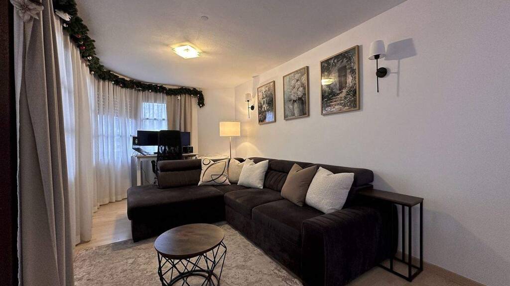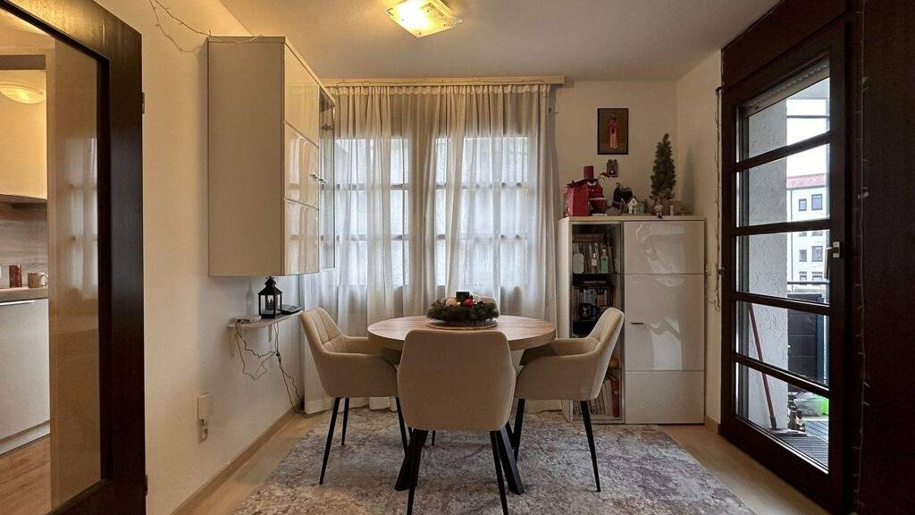 Das Wohnzimmer ist großzügig geschnitten und bietet direkten Zugang zum Balkon, welcher zusätzlichen Platz im Außenbereich schafft. Eine separat angeordnete Essecke ist in den Wohnbereich integriert und ermöglicht eine klare Trennung zwischen Wohnen und Essen. Durch die großen Fensterfronten herrscht ein angenehmes Raumklima.