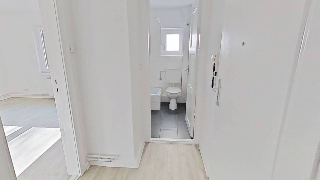 Mit einem Fliesenspiegel sowie allen notwendigen Anschlüssen ist in der Küche alles für Ihre persönliche Wunschküche vorbereitet. Das Tageslichtbadezimmer ist weiß-grau gefliest, modern designt und mit einer Dusche, einem WC sowie einem Waschbecken ausgestattet.