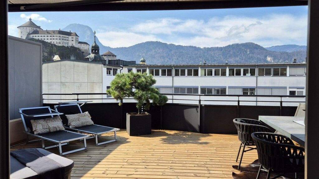 DIE OBERE EBENE - LOFT-CHARAKTER & PANORAMA: Hier findet das gesellschaftliche Leben statt. Der lichtdurchflutete Wohn- und Essbereich besticht durch seine offene Gestaltung inklusive Einbauküche. Das Highlight ist die angrenzende, ca. 40 m² große Südwest-Dachterrasse. Ausgestattet mit neuem Holzdeck, elektrischer Markise und einer praktischen Staukammer, genießen Sie hier einen unverbaubaren Blick auf die Festung Kufstein und die Tiroler Bergwelt.