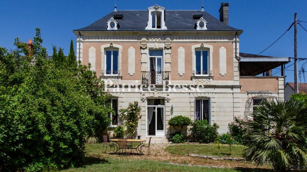 The house was built in the 19th century and can be seen at the corner of two streets in the village centre. The three-storey building made of tuffeau stone boasts a sober, rusticated masonry, stone ground floor with pink-ochre rendering on the first floor. On this level, pilasters, ironwork and entablatures amplify the opulence of the decorative features. The hipped, slate roof is punctuated with dormer windows flanked by bullseye windows. The remarkable symmetry of the buildings is only disrupted by the west-facing roof terrace on the first floor. To the rear of the house, there is a 300-m² southwest facing garden that can be reached from the street via an ironwork gate, a pedestrian gate or through the garage. The property stretches over a plot of almost 500 m².