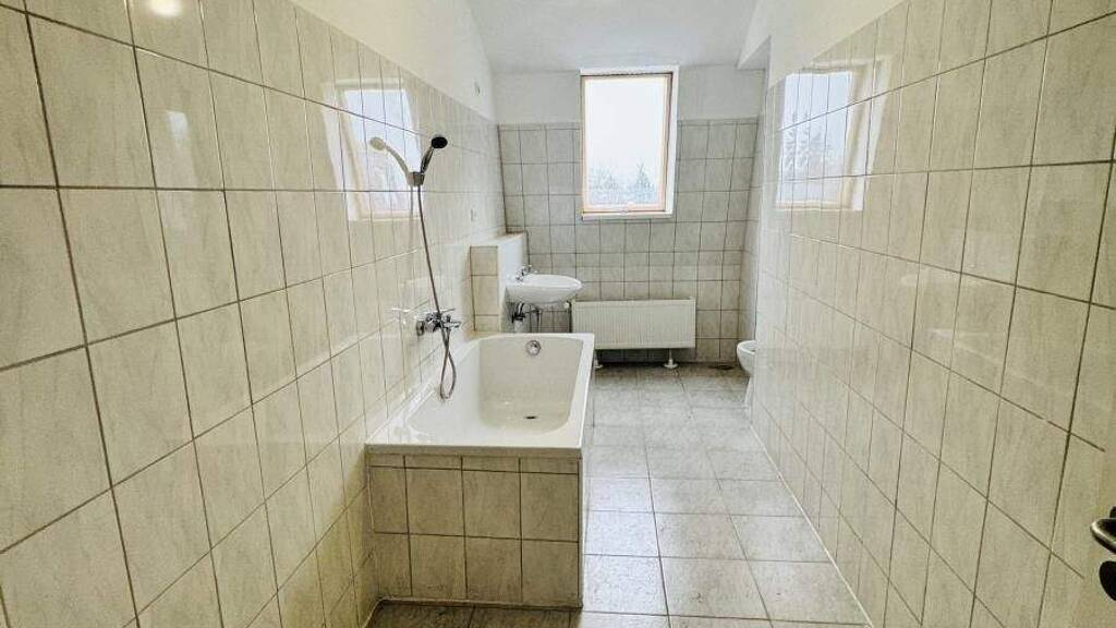 - Laminatfußboden - Fliesenboden im Flur - Wohnküche mit Küchenzeile - Kunststoffenster - gefliestes Bad mit Wanne und Tageslichtfenster - geräumiger Flur