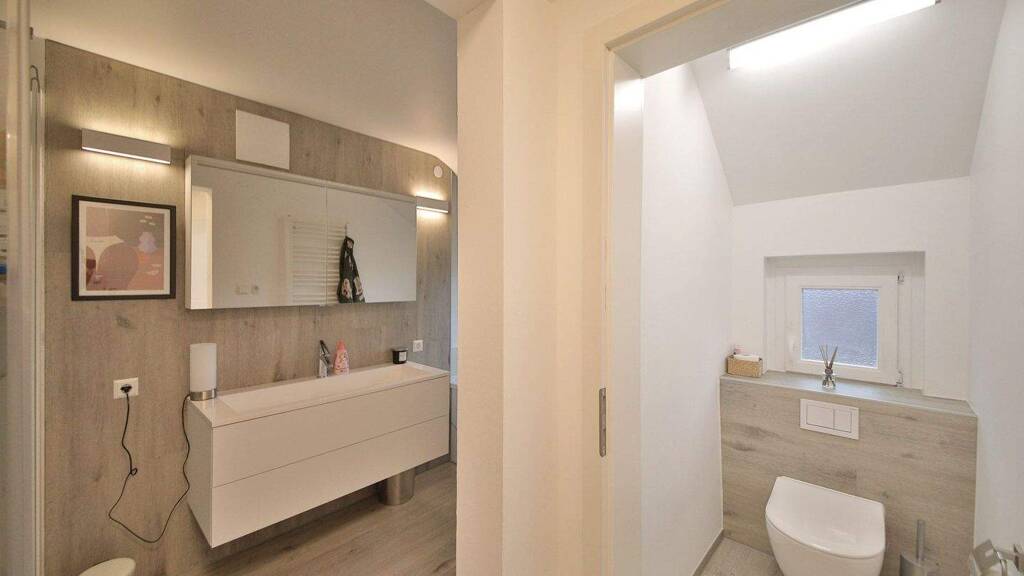 Die Wohnungen verfügen über eine großzügige Zimmeraufteilung mit insgesamt zahlreichen Wohn- und Schlafräumen, die flexibel genutzt werden können. Mehrere Badezimmer sowie ein zusätzliches Gäste-WC erhöhen den Wohnkomfort und unterstreichen die Alltagstauglichkeit des Hauses, insbesondere bei mehreren Bewohnern. Eine moderne Einbauküche ist bereits vorhanden und fügt sich harmonisch in das Gesamtbild ein.