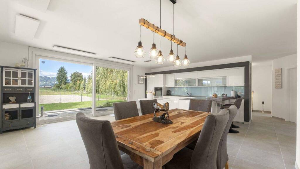 offener Wohn-, Ess- und Küchenbereich mit direktem Ausgang auf die Terrasse