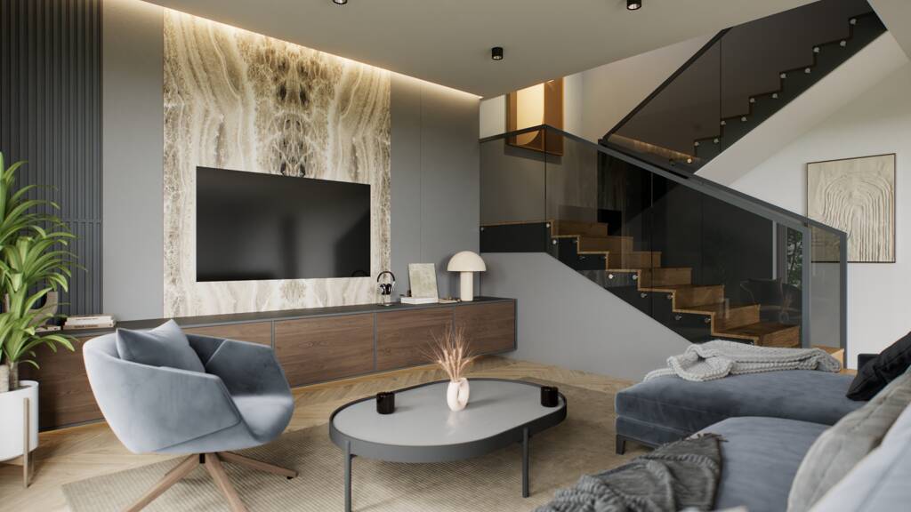 Die Eingangshalle kann durch die Haustür oder durch das Garagentor zur Wohnung betreten werden. Hier befinden sich das Gäste-WC, der Technikraum und eine praktisch eingerichtete Diele. Dank der Südausrichtung und der großen Fenster ist der zentrale Teil der Wohnung ein sonniges und sehr geräumiges Wohnzimmer mit einer amerikanischen Küche und einer 15 m² großen Terrasse. Im Erdgeschoss befindet sich ein weiteres Schlafzimmer mit eigenem Bad, und auch die Treppe, die nach oben führt, fügt sich schön in den Raum ein.