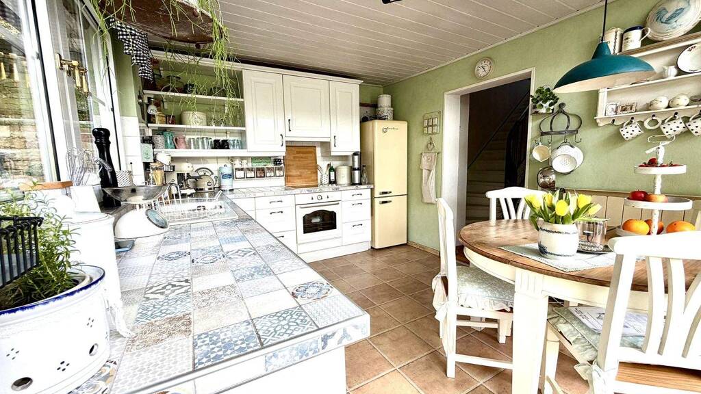 Beim Betreten gelangt man in einen einladenden Flur. Von dort geht es in die geschmackvolle Landhausstil-Küche, die direkten Zugang zur überdachten Südterrasse bietet. Von der Terrasse aus gelangt man in den liebevoll gestalteten Garten, der über Jahrzehnte auf mehreren Ebenen angelegt wurde.
