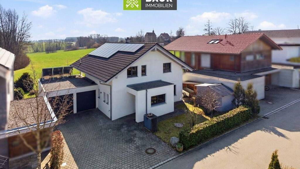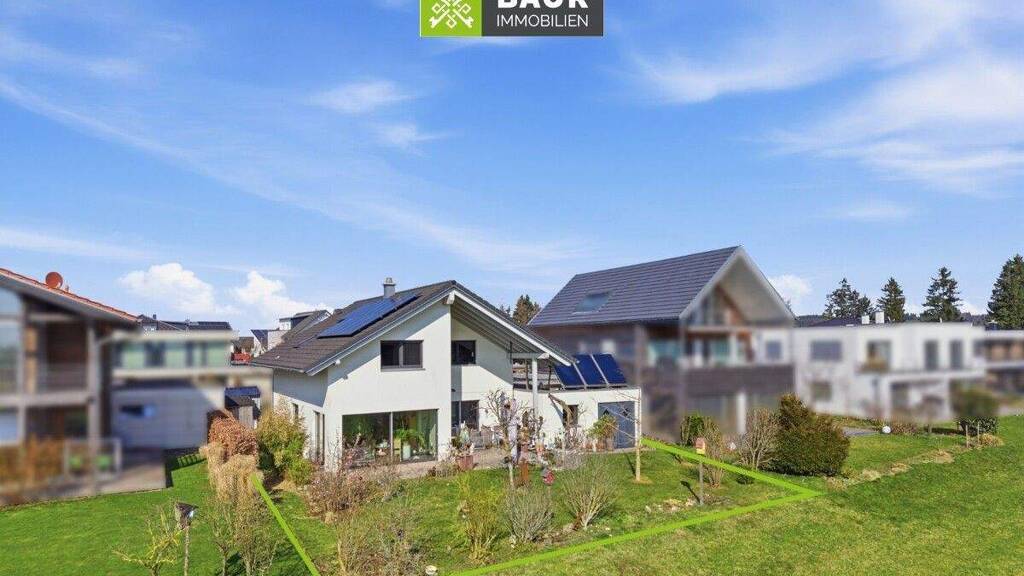 Dieses moderne Einfamilienhaus wurde 2014 als KfW-70-Haus in massiver Bauweise erstellt. Die schöne und ruhige Randlage des rund 554 m² großen Grundstücks bietet eine herrliche Aussicht.