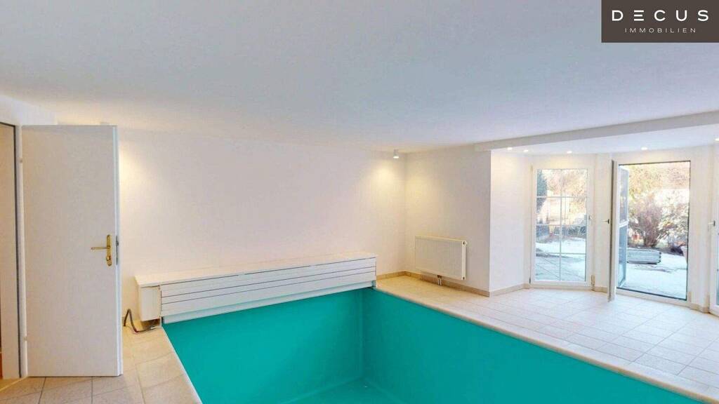 Im Untergeschoß welches ebenerdig in den Garten führt finden Sie Ihren persönlichen Wellnessbereich mit beheizbarem Indoor-Pool sowie einer Sauna und einem weiteren Badezimmer.