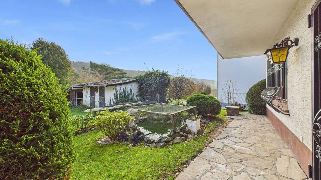 Im Untergeschoss stehen zwei weitere helle Räume zur Verfügung, die sich flexibel als Kinderzimmer, Gästezimmer oder Büro nutzen lassen. Besonders der größere Raum mit direktem Zugang in den Garten bietet einen hohen Wohnkomfort. Der Garten selbst ist liebevoll angelegt, mit verschiedenen Grünbereichen, einem kleinen Teich und Blick auf weite Felder. Hier können Familien, Tierliebhaber oder Hobbygärtner ihren eigenen Ruhepol gestalten. Durch die Hanglage wirken die einzelnen Bereiche besonders geschützt und privat. Zusätzliche Nutzflächen wie der Hauswirtschaftsraum und der Heizungsbereich sowie der direkte Zugang zur Garage runden das Angebot ab.