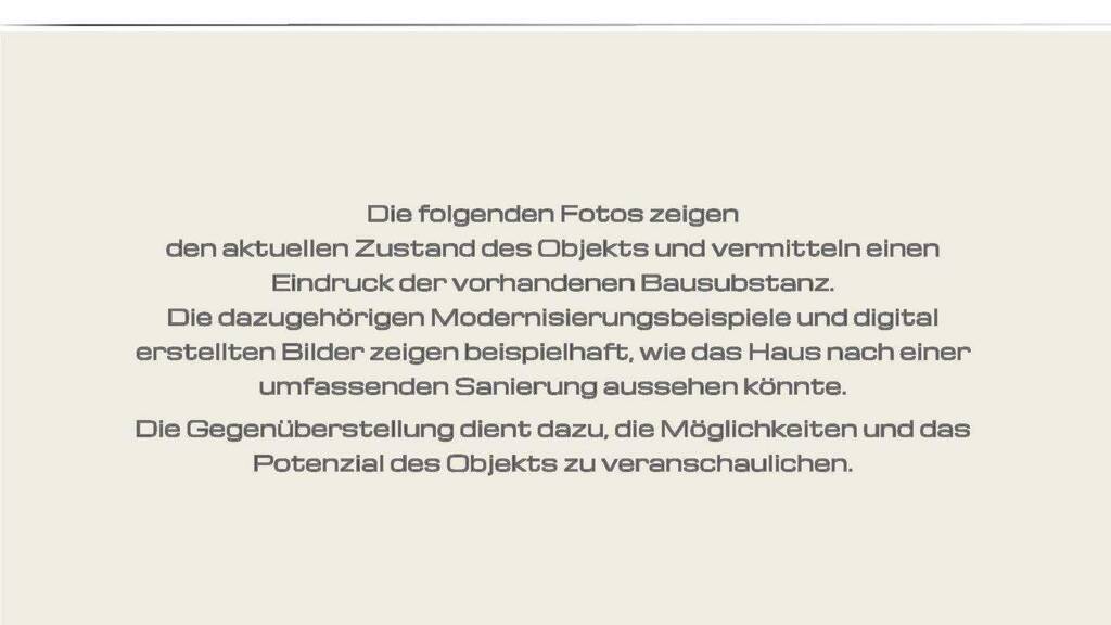 Die Gegenüberstellung der gezeigten Fotos aus Bestandsaufnahme und Modernisierungsbeispielen dient dazu, die Möglichkeiten und das Potenzial des Objekts zu veranschaulichen.