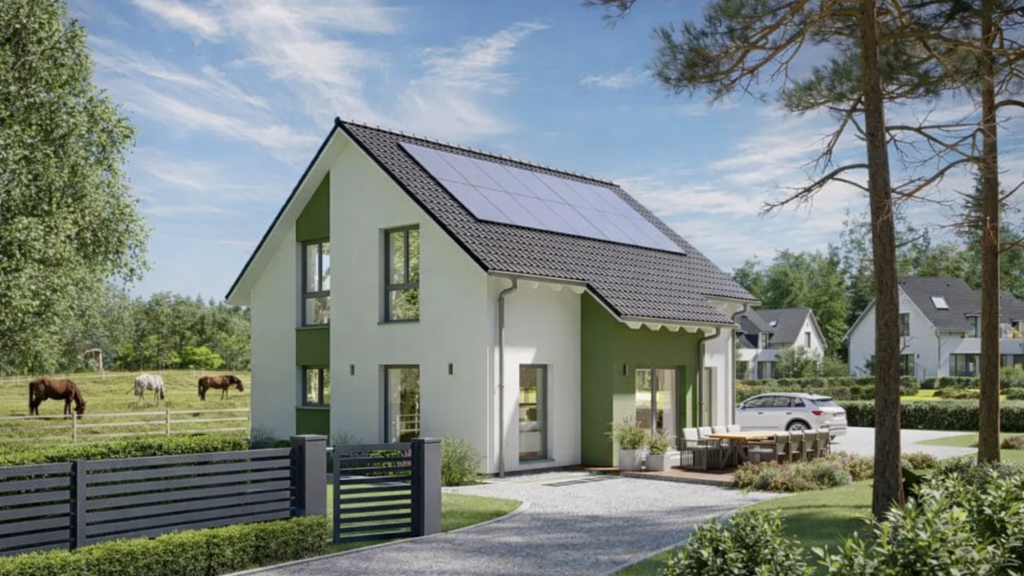 Wir projektieren dieses Hausmodell auf attraktiven Bau Flächen. Die gezeigte Lage dient als Beispiel für unsere aktuellen Bauplatz-Optionen.