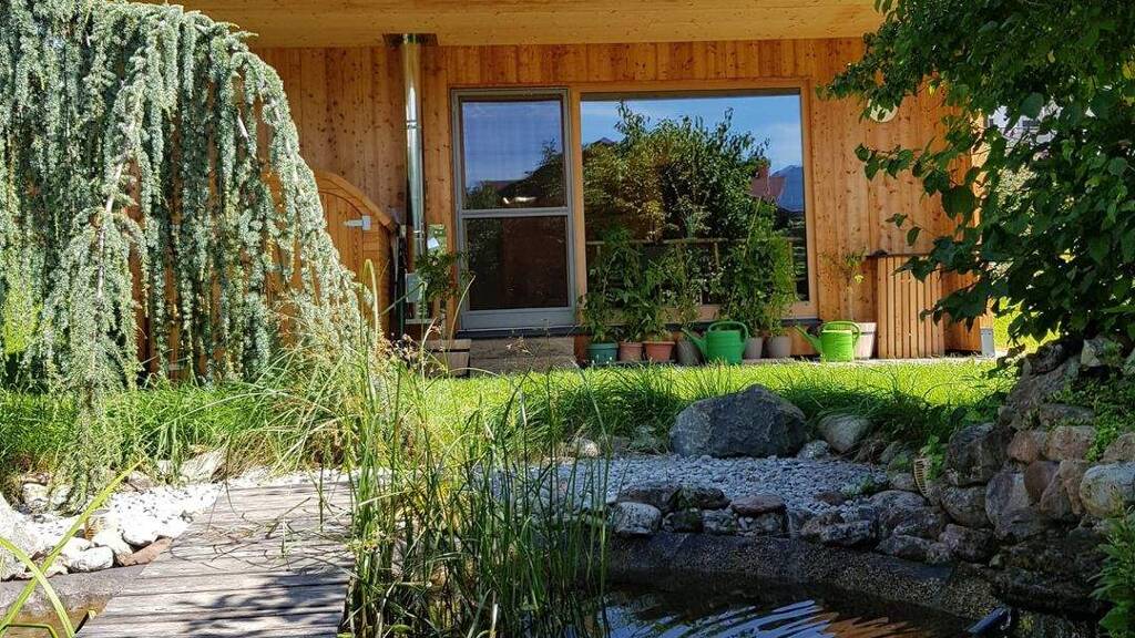 Der liebevoll und naturnah angelegte Garten wurde nach Prinzipien der Permakultur gestaltet mit Obstbäumen (z.B. Apfel), Sträuchern, Zedern, sowie ein kleiner feiner Naturteich mit Fischen, und eine eigene Wasserzisterne mit Brunnen. Dies alles vereint ökologisches Denken mit Ästhetik und Funktionalität.