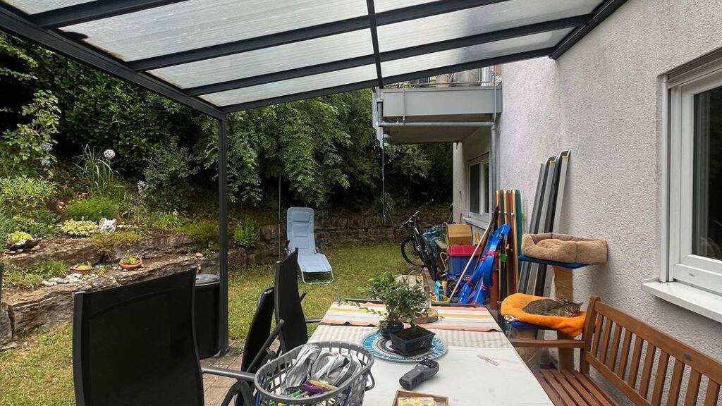 Der großzügige Garten mit überdachter Terrasse lädt zum Entspannen ein, während Hecken und Bepflanzungen für angenehmen Sichtschutz sorgen. Zwei Einbauküchen sind bereits vorhanden.