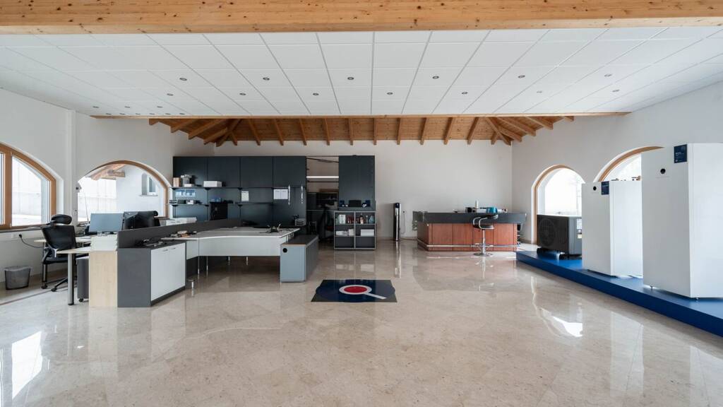 Das Hauptgebäude bietet eine großzügige Ausstellungsfläche, die aktuell als Büro- und Präsentationsraum genutzt wird. Ein einladender Empfangsbereich sowie eine Toilette runden das Raumangebot ab.