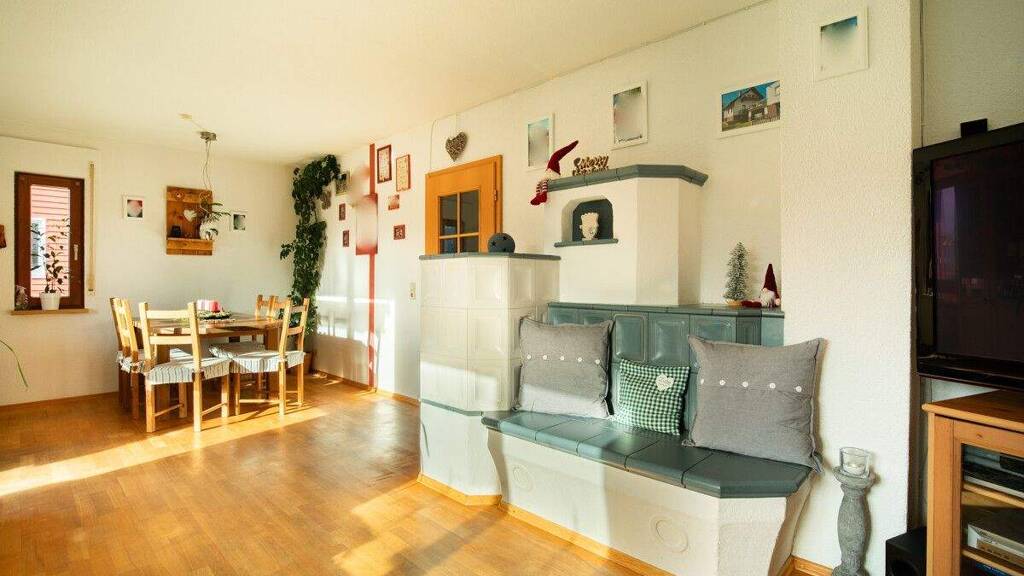 Die Hauptwohnung erstreckt sich über Erd-, Dach- und Untergeschoss und verfügt über eine Wohnfläche von ca. 120 m² zuzüglich rund 33 m² Nutzfläche. Bereits beim Betreten des Erdgeschosses überzeugt die klare Raumaufteilung: Hier befinden sich die Küche, ein großzügiges Wohnzimmer mit Zugang zum Balkon, ein Gäste-WC, ein Abstellraum sowie der direkte Zugang in den ruhig gelegenen Sitzbereich im Garten hinter dem Haus - ein geschützter Ort für entspannte Stunden im Freien. Eines der Highlights hier ist der Kamin im Wohnzimmer, der im Winter gemütliche Wärme liefert.