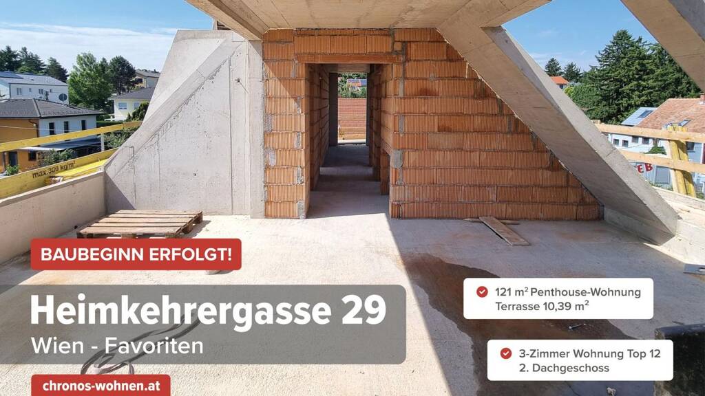 In der Heimkehrergasse, im 10. Wiener Bezirk wird die Chronos Wohnbau Gruppe ein Wohnbauprojekt mit 12?Wohnungen in der Größe von ca. 54m² bis 121m², sowie 9 Kfz-Abstellplätzen realisieren.