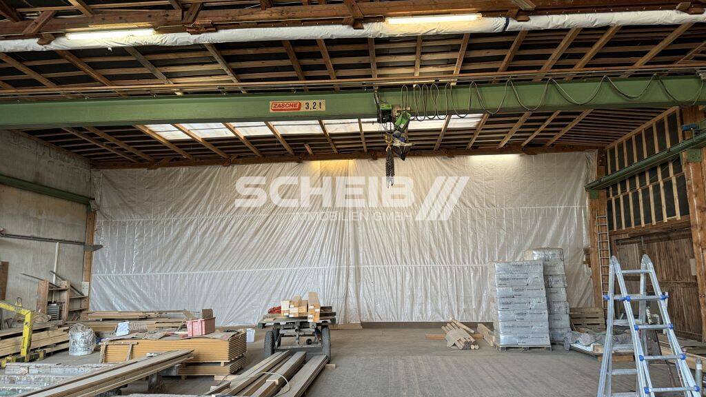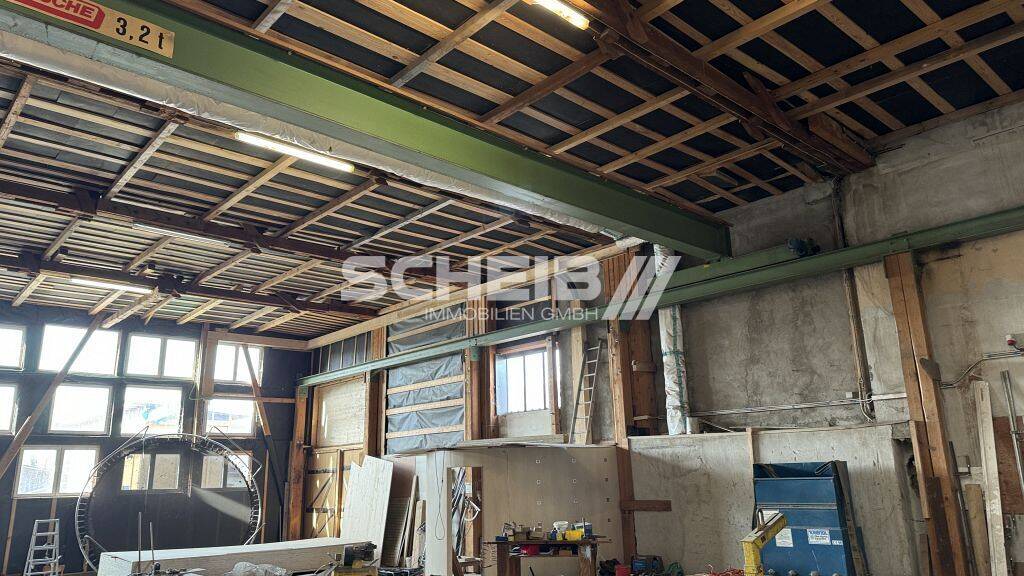 Die Halle verfügt über einen Kran und eignet sich ideal für Lager- oder Produktionszwecke.