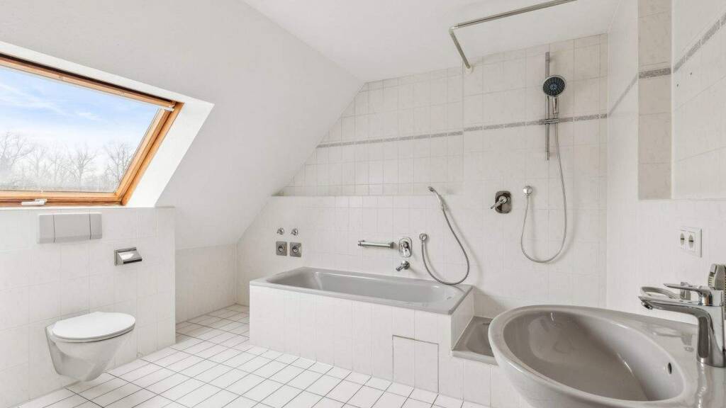 Ein großzügiges Tageslichtbad im Dachgeschoss ist mit Badewanne und Dusche ausgestattet und bietet komfortable Platzverhältnisse. Ergänzend steht auf der unteren Wohnebene ein separates Gäste-WC zur Verfügung.