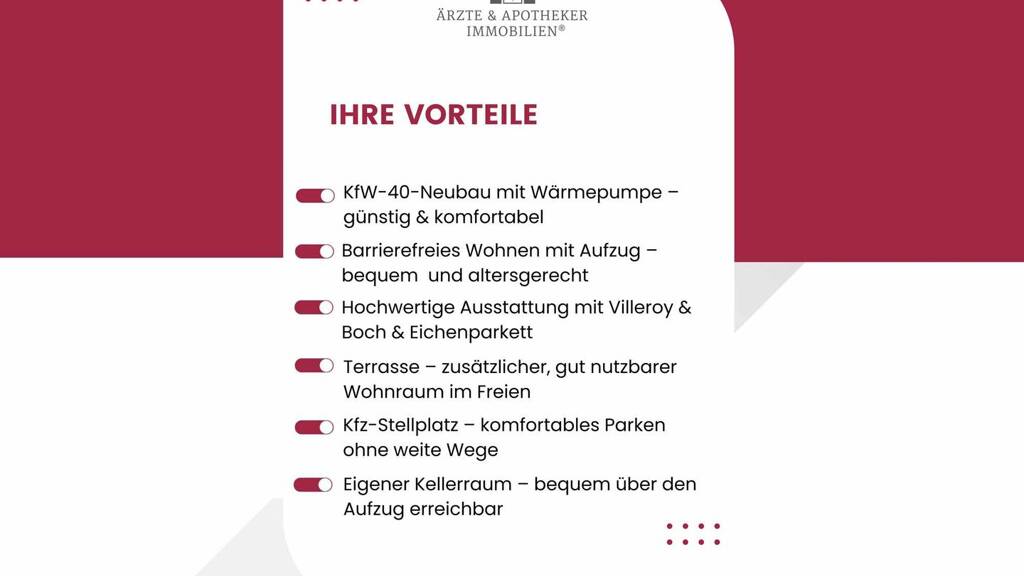 Diese exklusive 2-Zimmer-Neubauwohnung im Souterrain überzeugt als Erstbezug durch ein durchdachtes, barrierefreies Wohnkonzept, hochwertige Ausstattung und einen zukunftssicheren Energiestandard (KfW 40). Ideal für Selbstnutzer im besten Alter ebenso wie für Kapitalanleger mit Fokus auf langfristige Wertstabilität.