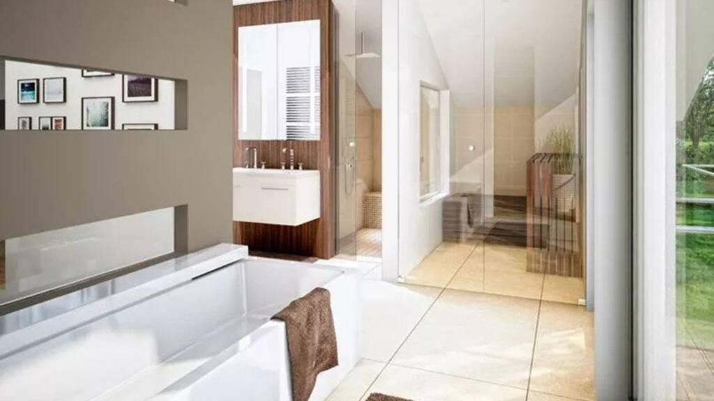 Dieses Haus im mediterranen Stil besticht mit vielen frischen Wohnideen. Schon von außen sorgt es mit seiner warmen, pastellfarbenen Fassade und dem rotbunten Dach für gute Laune. Ein schöner Blickfang ist das leicht hervorstehende Querhaus mit Satteldach, das den dahinterliegenden Räumen einen interessanten Schnitt verleiht. Sehr modern wirken die Fensterpartien: Sie reichen von schlanken Übereck-Verglasungen bis hin zu zweiflügeligen Fenstertüren im Erdgeschoss, die sich an warmen Sommertagen weit öffnen lassen. Das Innere des Fertighauses bietet Wohnkomfort pur. Bewohner und Besucher werden von einer repräsentativen Diele empfangen, die auch den Treppenaufgang beherbergt. Links schließen sich die Nebenräume, bestehend aus Garderobe, Gäste-WC und Technik- bzw. Hauswirtschaftsraum, an. Geradeaus mündet die Diele in den Wohn-, Ess- und Kochbereich, der mit seiner luftigen Weite beeindruckt. Geschickt wird das Wohnzimmer über ein schmales Wandelement vom kulinarischen Bereich abgetrennt. Dadurch entsteht zusätzliche Stellfläche für die Multimedia-Ausrüstung und schicke Esszimmermöbel. Vom Wohnbereich aus erreicht man einen weiteren Raum, der sich flexibel nutzen lässt. Mit 10 m² bietet er sich für ein ruhiges Arbeitszimmer an. Bei der Gestaltung kann die Baufamilie ihren Ideen freien Lauf lassen. Das Dachgeschoss steht hinsichtlich des Platzangebots der unteren Etage in nichts nach. Die Dachschrägen, die erst bei einer Höhe von 1,60 m ansetzen, verleihen den Räumen einen sehr gemütlichen Wohlfühlcharakter. Für die Kinder sind zwei großzügige Zimmer reserviert. Highlight sind die beiden Relaxbereiche vor dem bodentiefen Fenster im Querhaus. Die restliche Fläche teilen sich der Elternschlafraum, das Familienbad und eine kleine Abstellkammer.