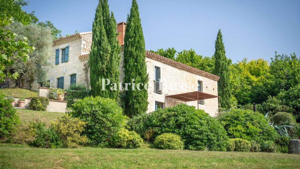 In the same alignment, two recently constructed buildings with wooden cladding are set against a backd-rop of lime trees that provide shade on sunny days. They nestle into the hillside and are well integrated into the grounds. Between them, a concrete staircase leads to the upper part of the plot where the main residence and an outbuilding standing opposite can be found. Inspired by Provence, small stone walls underline the terraced garden, filled with many tree types typical of southern France. From a patio adjoining the residence's southern façade, a flight of steps leads to a vast swimming pool area, surrounded by lush and exotic vegetation. The buildings overlook the various terraces in the grounds and approximately 1.5 hectares of land on which there is an orchard and a meadow, bordered by old trees.