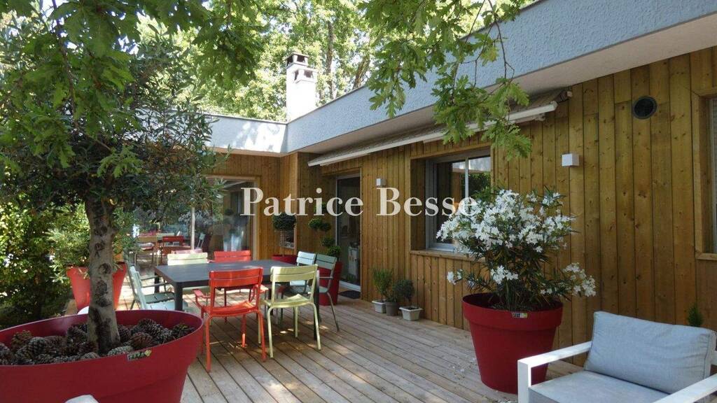 It offers a 110m² floor area. The dwelling was built in 1974 and has been renovated in recent years. Its facade looks west and its terrace faces south, looking towards Arcachon Bay. Its roof terrace is made of concrete planks. Its elevations are adorned with timber cladding, punctuated with windows of different sizes, many of which are large. Inside, there is a vast dual-aspect lounge, which forms a convivial space bathed in natural light from broad glazed sliding doors that look out at the garden. This lounge leads to an open-plan fitted kitchen with work surfaces and a central island unit covered with marble. The lounge also leads outside to a terrace of timber decking - the perfect spot for open-air meals and moments of relaxation, which the climate here makes possible for most of the year. There are four bedrooms. They have built-in wardrobes and their decoration is minimalistic yet colourful. There is also a modern bathroom and a separate lavatory. One of the bedrooms has its own en-suite shower room. Wood strip flooring extends across the rooms. The bedrooms have plant-fibre carpeting upon their wood strip floors. Some walls are painted white, others are painted colourfully and some are timber-clad. The garden has let the coastline's environment shape it and it has made the most of the mild climate to let its own vegetation thrive here. Indeed, it forms an open-air haven of greenery with sandy ground. Tall oaks tower beside rhododendrons, a Japanese tulip tree stands by large camelias and oleanders flourish on the terrace next to an olive tree and box shrubs. The salty sea air and changing natural light add to the site's charm. Birdsong accompanies the lapping of the water in Arcachon Bay. In the distance, you can make out the silhouettes of traditional beach huts on stilts - emblems of the bay - with a clear blue sky as their backdrop. At the bottom of the garden, there is a garage that has been converted into a 35m² studio apartment with a lounge, a kitchenette, a shower room and a lavatory. It also houses a large air-conditioned wine cellar.