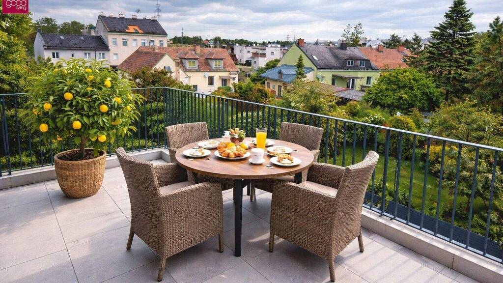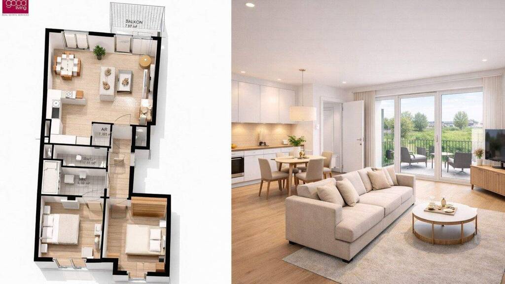 Der offen gestaltete Wohn- und Essbereich bildet das HerzstĂĽck der Wohnung und bietet direkten Zugang zum Balkon - ideal fĂĽr entspannte Stunden im Freien.