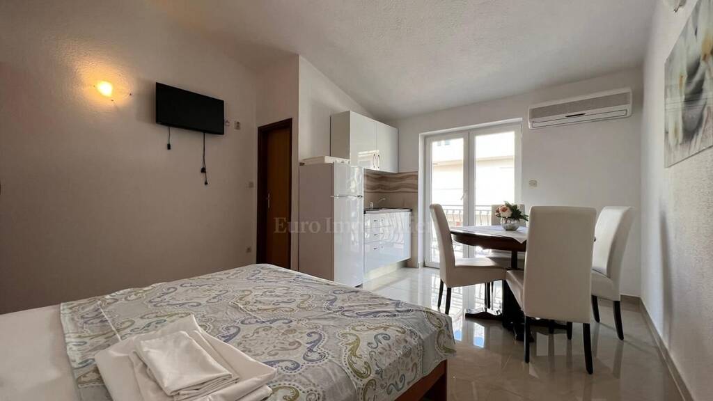Zum Verkauf stehen zwei Studio-Apartment 26 m2, und eine Einzimmerwohnung 40 m2. Die Wohnungen befinden sich im dritten Stock des Apartmenthaus und werden mit einem Garagenplatz verkauft. Weitere zwei Wohnungen können Parkplätze in unmittelbarer Nähe des Grundstücks anmieten. Alle Wohnungen wurden 2021 renoviert. Sie haben separate Eingänge, sind komplett ausgestattet, möbliert und klimatisiert und werden als solche verkauft. Jede Wohnung verfügt über eine Galerie, die als Schlafzimmer genutzt werden kann. Warmwasser wird durch Sonnenkollektoren gewonnen, die auf dem Dach des Hauses installiert sind. Die Immobilie befindet sich im westlichen Teil von Makarska und ist etwa 400 Meter vom Strand entfernt. Der Standort selbst ist ideal, um in den Tourismus zu investieren. Jede Wohnung hat ihre eigene Grundbuchaufzug, aber sie werden zusammen verkauft. Es besteht die Möglichkeit, über einen Bankkredit zu kaufen. Gelegenheit!