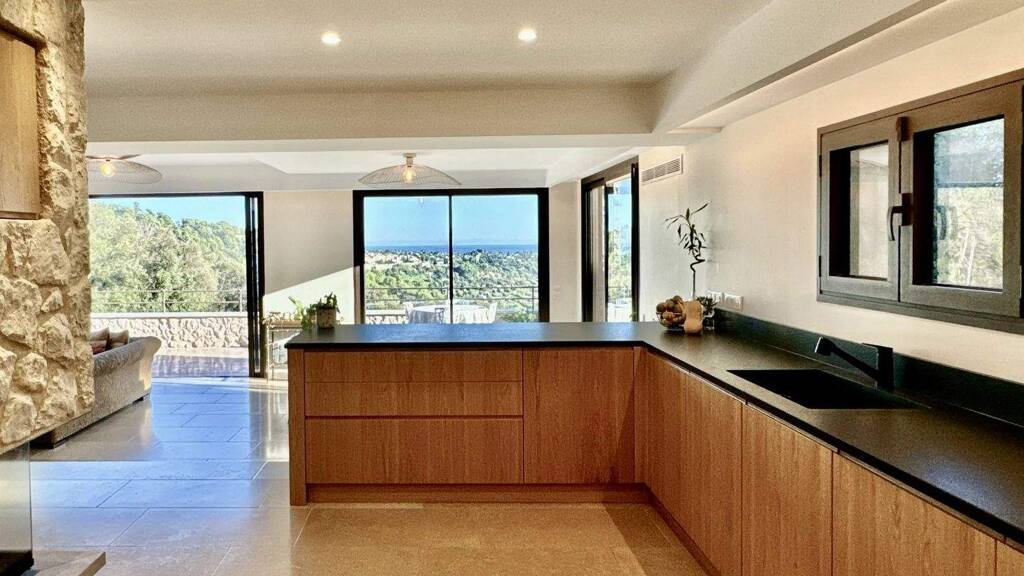 From the living room, you enjoy a breathtaking view of the landscape thanks to the large sliding windows that disappear into the wall when opened, creating a seamless transition between rooms. An ideal place to enjoy the sun and the mild Mediterranean climate.