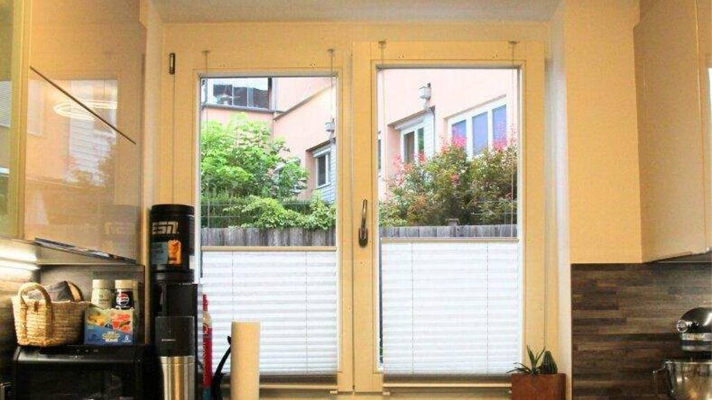 Das Erdgeschoss überzeugt mit einer separaten Küche sowie einem großzügigen Wohnzimmer mit Essbereich. Die großen Fenster schaffen eine helle, einladende Atmosphäre und öffnen den Blick in den eigenen Garten, der direkt vom Wohnraum aus begehbar ist. So entsteht ein harmonisches Zusammenspiel von Innen- und Außenbereich.