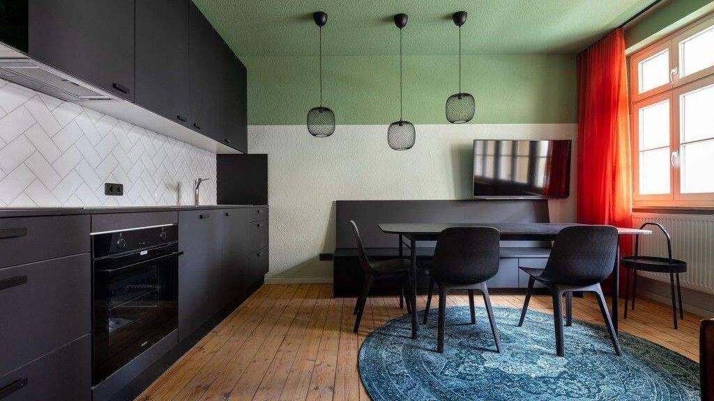 In einem denkmalgeschützten Altbau, Baujahr 1900, sind 2022 diese exklusiven Studentenapartments mit besonders viel Stil und Charisma entstanden. Jede Wohnung verfügt über eine hochwertige Gemeinschaftsküche mit Sitzgruppe und lädt zu gemeinsamen Kochabenden ein, auch ein wandhängender TV ist bereits vorhanden. In den Fluren befinden sich Garderoben und Sitzbänke. Besonders schön: Ein Gemeinschaftsbalkon ist von der Küche aus begehbar. Die Badezimmer jeder Etage bieten 2 Waschbecken mit Spiegel und Unterschränken, ein wandhängendes WC, Ablageflächen für Kosmetika & Co. sowie bodentiefe Walk-In-Duschen mit verglasten Duschkabinen. Zeitgemäße Akzente in den Trendfarben Schwarz, Weiß und Mintgrün spiegeln sich in den individuell gestalteten Gemeinschaftsräumen wider. Diverse Altbau-Elemente akzentuieren sich stilvoll in das moderne Gesamtbild der Wohnräume. In der Waschküche des Hauses stehen allen MieterInnen zur gemeinsamen Nutzung Waschmaschinen und Trockner zur Verfügung, auch ein praktischer Fahrradkeller ist vorhanden. Diverse Sitzmöbel im Garten laden zu entspannten WG-Abenden unter freiem Himmel ein.