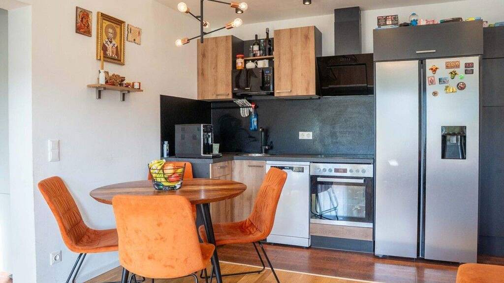 Der offen gestaltete Koch-, Ess- und Wohnbereich bildet das Herzstück der Wohnung und sorgt für eine helle und freundliche Wohnatmosphäre. Beheizt wird die Wohnung über eine Infrarotheizung, ergänzt durch eine elektrische Fußbodenheizung im Badezimmer, im Eingangsbereich sowie in der Küche. Das Badezimmer ist mit Badewanne, WC und einem Waschmaschinenanschluss ausgestattet und bietet ausreichend Platz für Waschmaschine und Trockner.