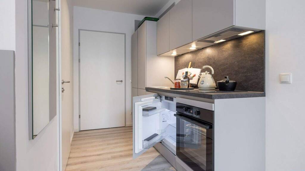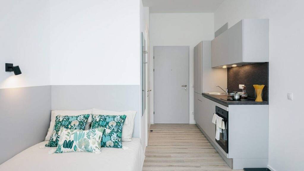 * Ein bequemes Bett * Einen Einbauschrank und ein Bücherregal * Einen Schreibtisch, der für produktives Arbeiten konzipiert ist * Eine voll ausgestattete Küchenzeile für Ihre kulinarischen Experimente * Ein privates Badezimmer mit moderner Dusche