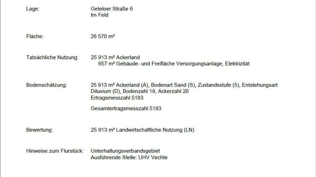 In der Gemeinde Itterbeck soll im Namen des Eigentümers eine landwirtschaftliche Ackerfläche in der Größe von 26.570 m² veräußert werden. Auf 657 m² davon wird ein Schieberbauwerk für Elektrizität betrieben.