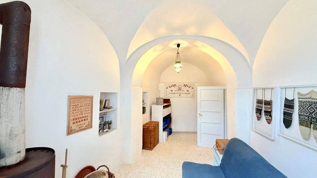 Auf rund 120 m² Wohnfläche verbindet das Anwesen historische Architektur mit zeitgemäßem Wohnkomfort. Die Raumaufteilung erstreckt sich über vier Ebenen und ist ebenso charmant wie funktional. Im Erdgeschoss empfängt Sie ein Eingangsbereich, der in das Wohn-/Esszimmer mit Übergang in die Küche führt. Vom Eingangsbereich geht eine Treppe hinab ins Untergeschoss, wo sich das Wannenbad sowie ein Gewölberaum mit originalem Felsen befinden – angenehm kühl in den Sommermonaten und daher ideal als zusätzliches Gästeschlafzimmer nutzbar. Beide Räume verfügen über Fenster zur Gasse. Über die Treppe nach oben gelangt man in die Schlafebenen und auf die Dachterrasse: In der ersten Etage befindet sich ein großzügiges Schlafzimmer, während die zweite Etage zwei ineinander übergehende Schlafzimmer bietet, die bei Bedarf auch getrennt werden können. Das kleinere Zimmer eignet sich zudem hervorragend, um ein zweites Badezimmer zu realisieren. Die oberste Etage wird schließlich von der Dachterrasse gekrönt. Die ca. 30 m² große, hervorragend besonnte Dachterrasse mit Sommerküche ist zweifellos eine der schönsten Terrassen im Ort. Ein über alle Etagen wachsender Weinstock spendet unter der romantisch umrankten Pergola angenehmen Schatten und trägt köstliche Trauben. Von hier öffnet sich ein freier, ungestörter Blick über die Schieferdächer des Dorfes bis hin zu den Gipfeln der umliegenden Berge – ein Ort der Ruhe und Inspiration, perfekt zum Entspannen, Genießen und Verweilen vom Morgen bis in die lauen Abendstunden.